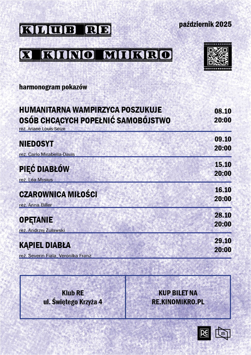 Kino Mikro i Klub RE ponownie łączą siły! W październiku - miesiącu duchów - zapraszamy na cykl nieszablonowych, magicznych i niepokojących seansów filmowych. W repertuarze znajdziecie zarówno horrory (ale nie takie oczywiste), jak i kino gatunkowe wymykające się wszelkim klasyfikacjom. Przygotujcie się na dawkę filmów, które hipnotyzują, uwodzą i zostają w głowie na długo.