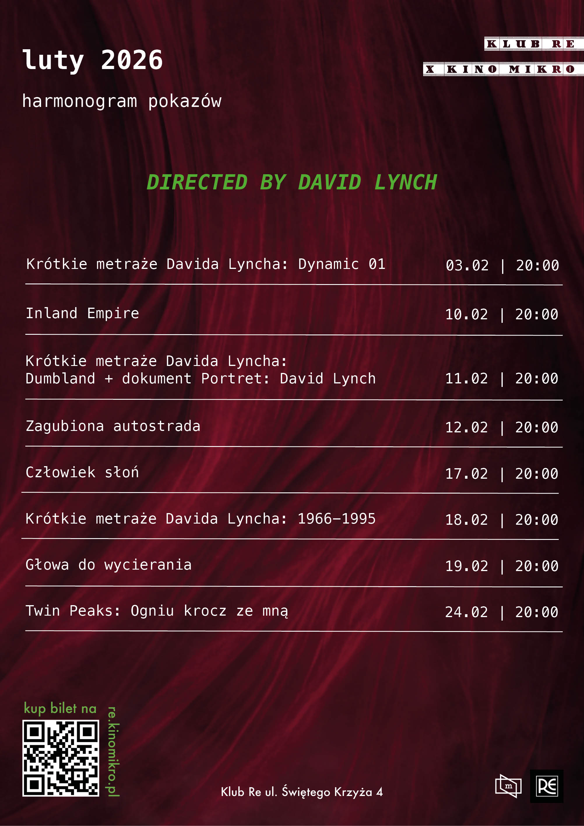✨ Kino Mikro i Klub RE zapraszają na wyjątkowy przegląd filmów Davida Lyncha — mistrza niepokoju, surrealizmu i snów, które wydają się bardziej rzeczywiste niż rzeczywistość.
