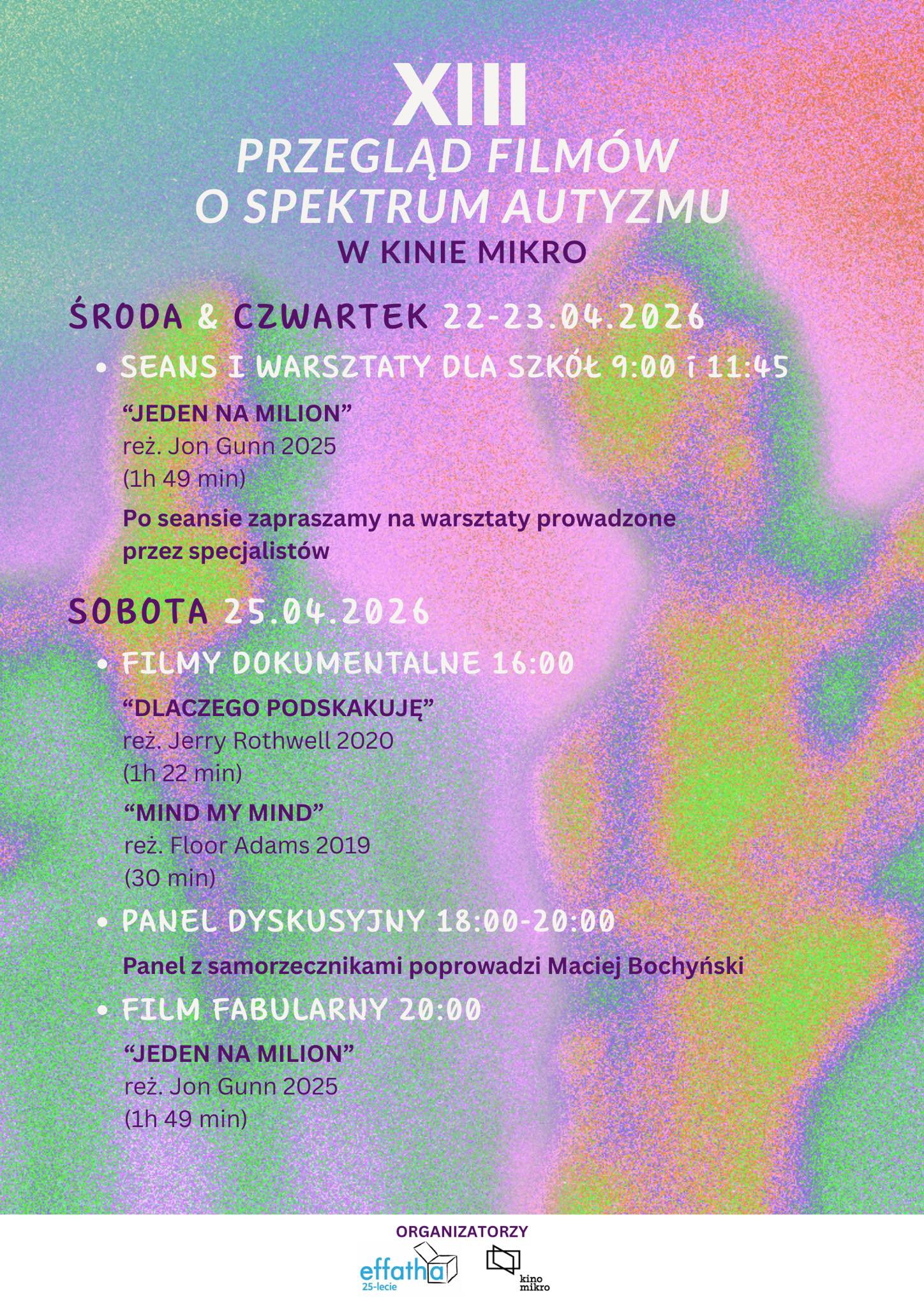Już po raz trzynasty Ośrodek dla Osób z Autyzmem „Effatha” wraz z Kinem Mikro zapraszają na Przegląd Filmów o Spektrum Autyzmu. 25 kwietnia 2026 roku wyświetlimy dla Was filmy, które w poruszający i nieoczywisty sposób opowiadają o doświadczeniach osób w spektrum.